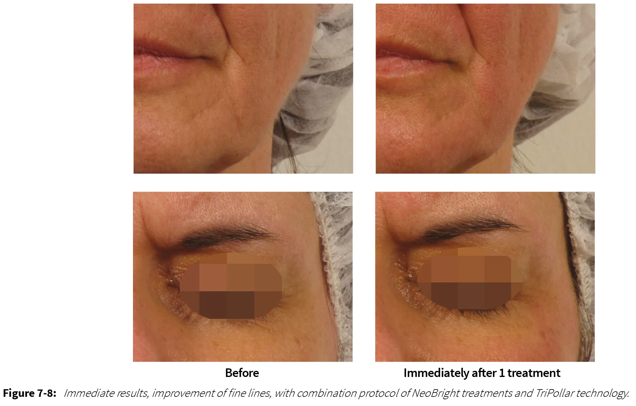 Digital photographs of subjects demonstrated an overall improvement in skin appearance immediately after treatment and following last treatments. Treatment effects included a general improvement of skin texture, indication for reduction of pore size and general brightening of skin tone. In some cases a visible improvement of periorbital wrinkles was noticed.
