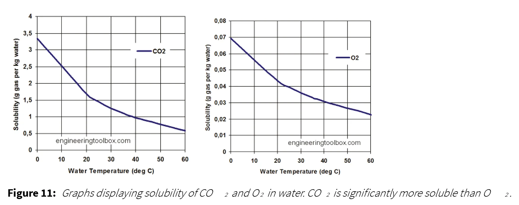 Transcutaneous CO2 delivery has been well documented and studied. CO2 is water soluble and therefore is an ideal gas for transcutaneous delivery. The graphs below (Figure 11) demonstrate the solubility of CO2 compared with solubility of O2 in water. Note that at room temperature of 200C ±, solubility of CO2 is about 1.5 g/kg water and solubility of O2 is only 0.04 g/kg water. Therefore CO2 transcutaneous delivery is quite effective in room temperature using water base solvent such as the OxyGeneo treatment gels.