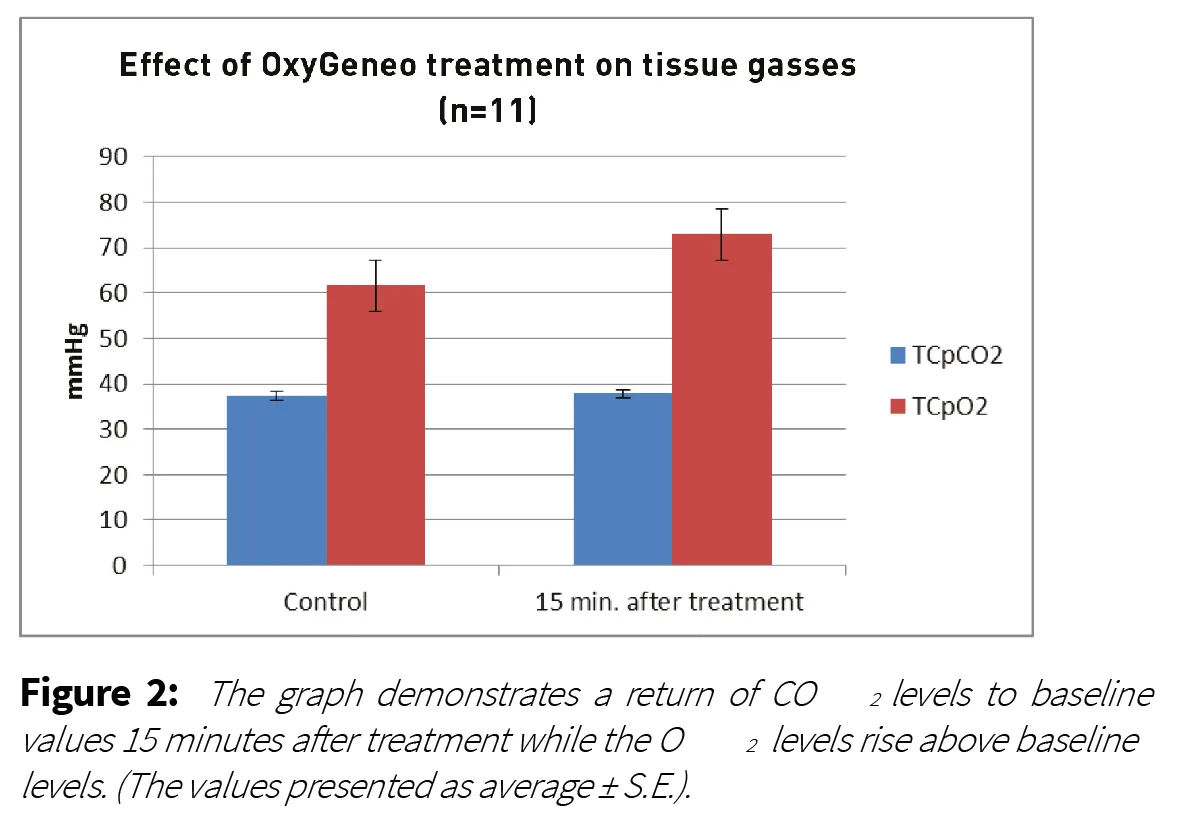 Methods: To investigate the OxyGeneo treatment mechanism, an evaluation of blood perfusion and tissue CO2 and O2 levels was conducted on 11 subjects on different anatomical areas. Measurements were performed at baseline (before treatment), immediately after and 15 minutes post a 10 minute OxyGeneo treatment.