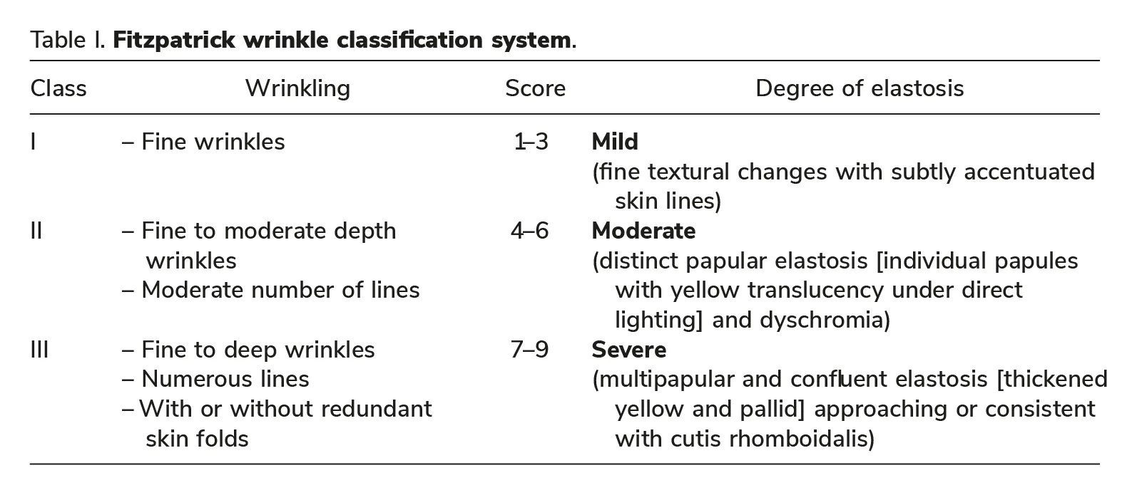 For treatment effi cacy evaluation, baseline and 3 months follow-up photographs of each subject were randomly presented and scored by two independent physicians (blinded evaluators) using the Fitzpatrick Wrinkle and Elastosis scale (Table I) (15).