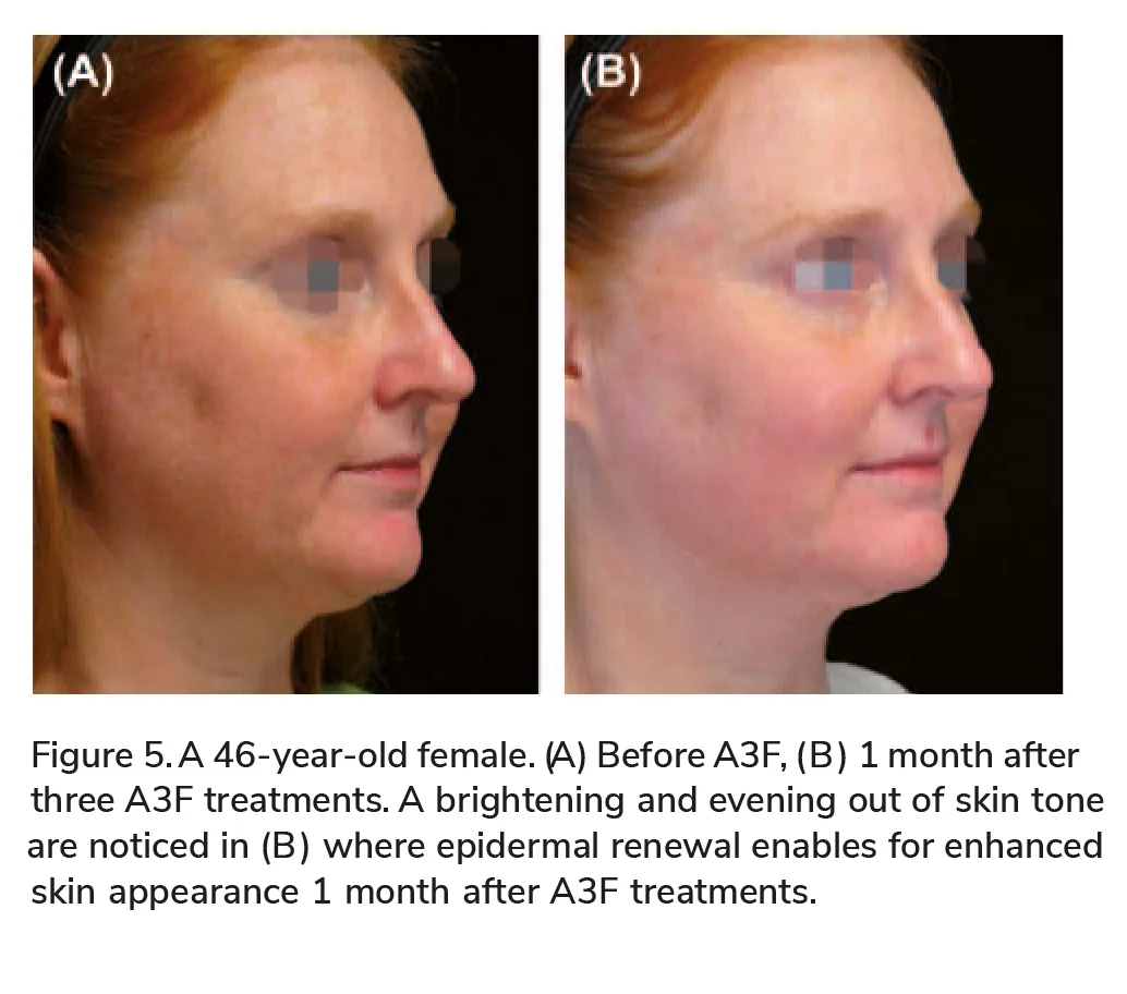 This specifi c study was for evaluation of the A3F for treatment of wrinkles; no objective measurable data were gathered to evaluate and grade skin tone improvement, texture improvement, or general skin tightening. However, review of subjects ’ photos and subject ’ s feedback of improved skin texture defi -nitely demonstrate the effect of skin resurfacing and the evening out of skin tone imperfections, most pronounced at 1 month posttreatments, as the epi-dermal layer is freshly renewed and rejuvenated (Figure 5).