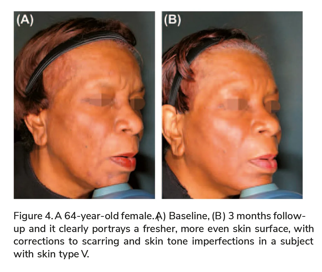 As demonstrated in Figure 4, the A3F treatment was found to be safe and effective for dark skin types resulting in improved skin complexion, evening out of skin tone and imperfections. This result indicates a major advantage of the TriFractional technology over other existing resurfacing options.