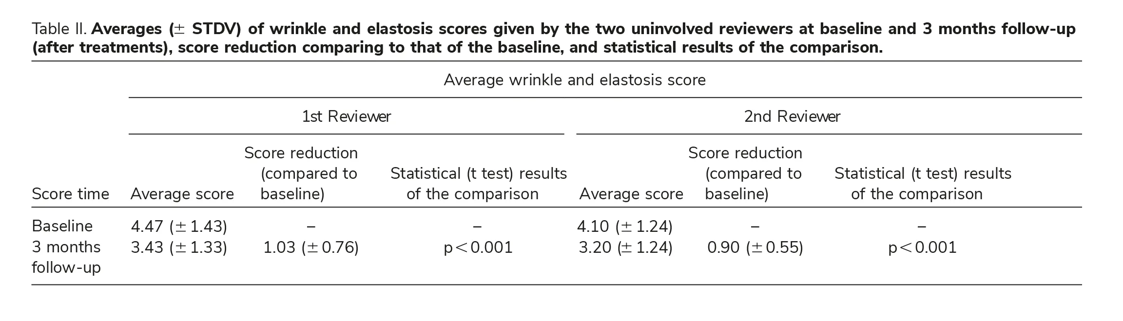 Analysis revealed an improvement in wrinkle appearance in the majority of study subjects (80% according to one reviewer and 73.3% according to the second reviewer). Score differences were found to be statistically signifi cant (p 0.001) for both reviewers, further indicating treatment effi cacy. Table II and Figure 1 represent averages ( STDV) of Fitzpatrick scores given by the two reviewers at baseline and 3 months follow-up.