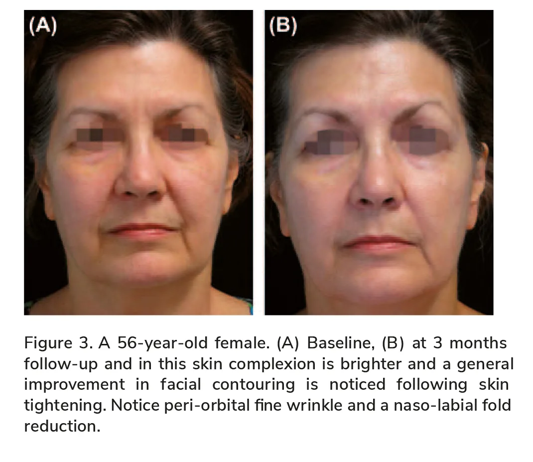 RF skin resurfacing is an effective method for facial enhancement as the epidermis is renewed over a short time allowing for a more uniform skin tone. In the dermis, the thermal effect following epider-mal ablation results in enhanced skin tightening through re-bundling of existing collagen and through generation of new collagen via process of neocol-lagenesis that will continue several months past the procedure (16).