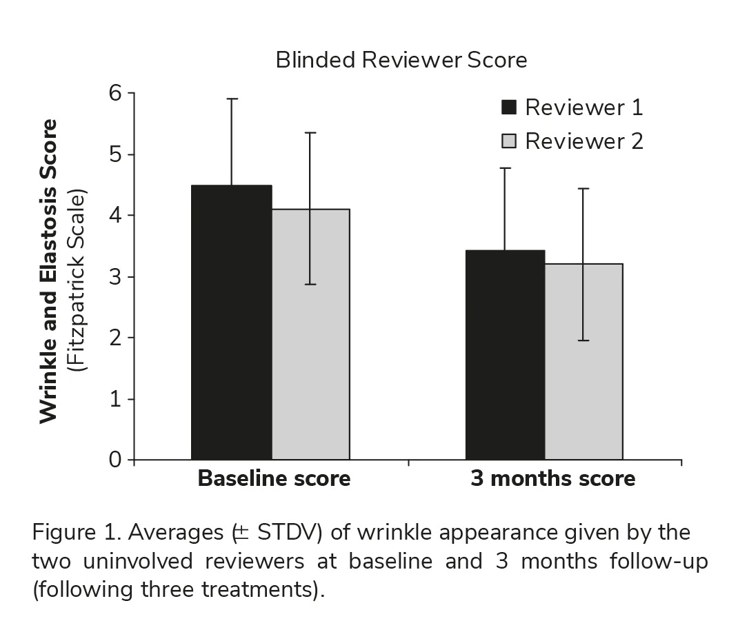 In addition to the effi cacy evaluation established by the blinded evaluators, each Principal Investigator (PI) visually inspected and graded each subject using the Fitzpatrick Wrinkle and Elastosis scale at baseline and at 3 months follow-up visit.