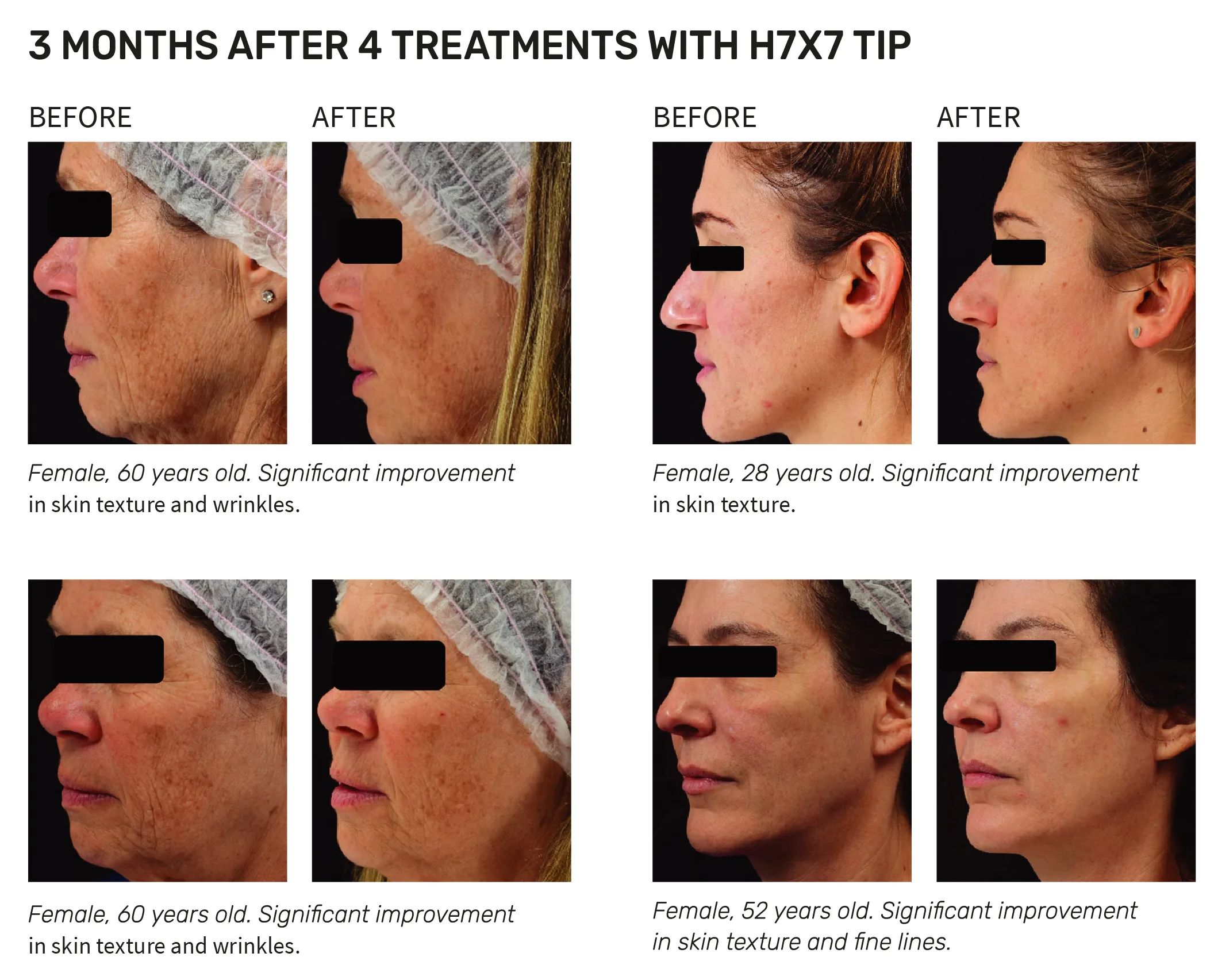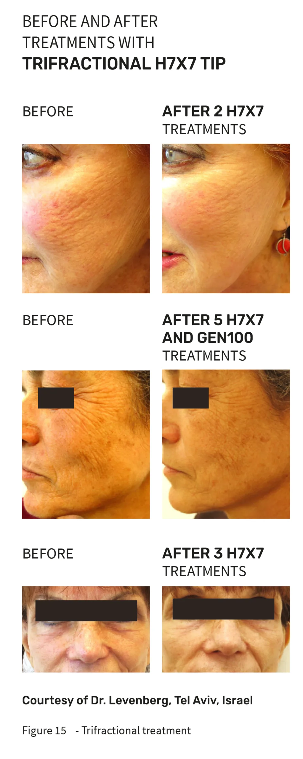 A clinical evaluation of skin texture improvement and wrinkle reduction using Fractional RF resurfacing with TriFractional H7x7 tip (Pollogen, 2019) A recent clinical evaluation of the TriFractional H7x7 tip (Pollogen, 2019) for skin texture improvement and wrinkle reduction provide evidence of the safety and efficacy of the treatment. Twelve females, ages 29-60 (50±9), Fitzpatrick skin type II-IV, received four full face TriFractional treatments at 3-weeks interval. All patients returned for 1 and 3 months follow up. Efficacy: Treatment was well tolerated; pain levels remained low throughout the study and no topical anesthesia was required. Improvement in brightness and wrinkles noticed by patients from the first treatment. All patients (100%) saw overall improvement at 1 month follow up and 93% of patients saw improvement in skin texture at 3 months follow up. See additional details in table 1. Most of the patients (75%) reported positive self-assessment changes in all treatment areas following second treatment. Moreover, although not specified as treatment indication, 25% reported an improvement in their acne scars as an additional benefit. Safety: Transient erythema and edema observed in all patients lasting for a few hours. No adverse events were reported before, through and after the treatment. Downtime: All patients reported that they felt comfortable to go out in public one day after the treatment. Conclusion: H7x7 TriFractional treatment found to be safe, well tolerated and effective for skin texture improvement, with minimal discomfort and downtime resulting in improved brightness, skin tightening and wrinkle reduction (Figures 1-4).