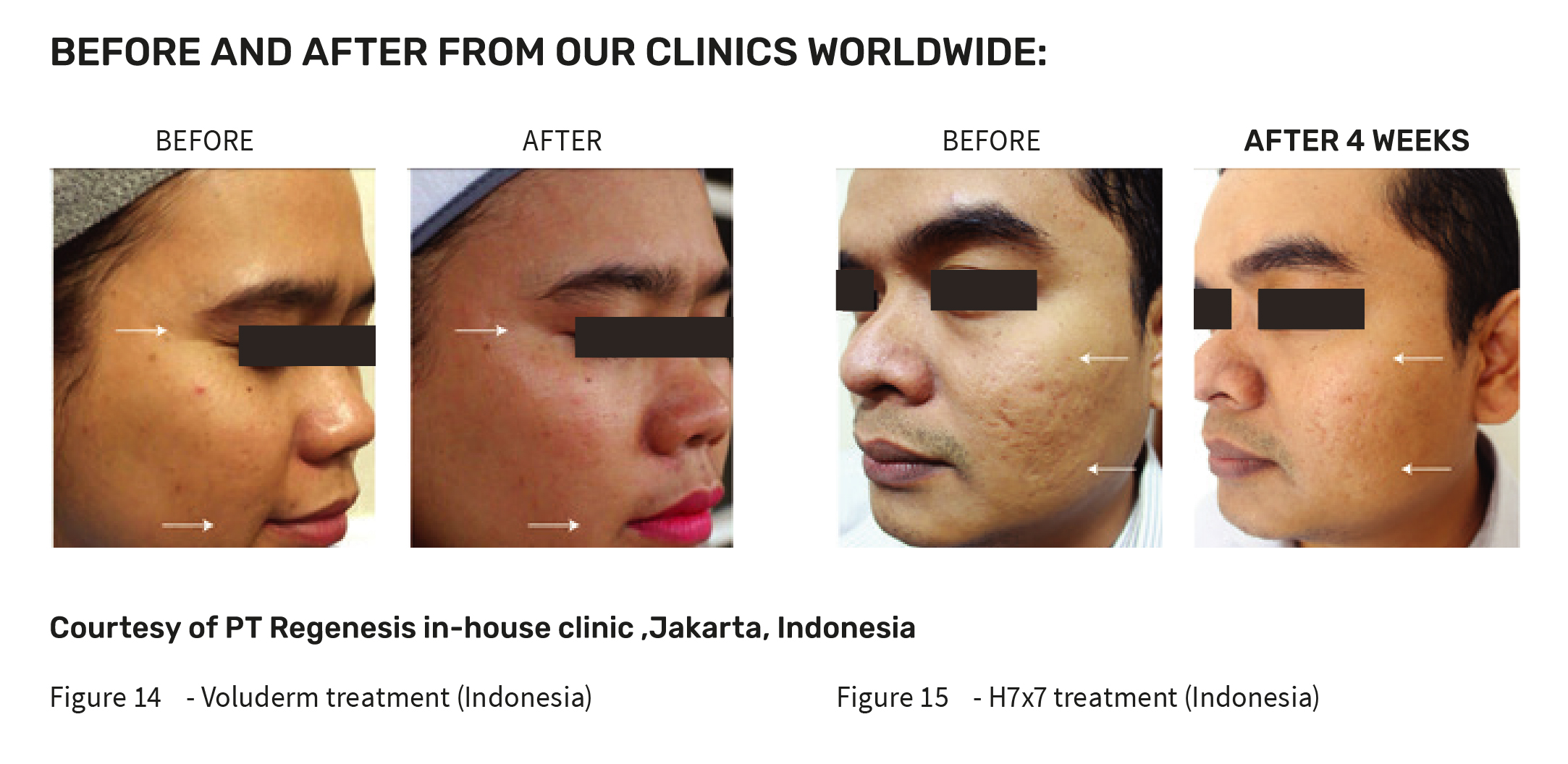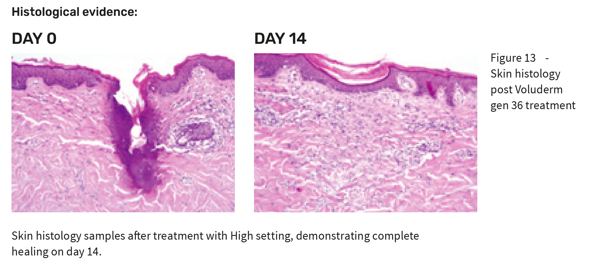 Gershonowitz et al. (2014) evaluated the safety and efficacy VoluDerm gen 36 technology through histological evaluation of morphological changes in the target tissue. Immediate VoluDerm epidermal and dermal effects and progress of healing process, as function of time following treatment. Histology analysis of samples of 14 days demonstrated complete healing for all energy levels (Figure 13). Results: This In-Vivo histology confirmed the safe and effective performance of the VoluDerm treatment. A fractional pattern demonstrated affected areas, surrounded by healthy tissue. Healing process proved natural dermal renewal and epidermal complete regeneration. Histology supports clinical advantages of the VoluDerm natural looking skin enhancement. Conclusion: The major impact of VoluDerm is on the dermal layer, thus treatment is associated with less to no downtime, less patient discomfort, and less predisposition to side effects compared to other technologies in which penetration mechanism is mechanical. With VoluDerm, the visible impact on the epidermal layer is relatively minor and less prominent although the desired micro resurfacing effect is achieved. (8) Histological evidence: