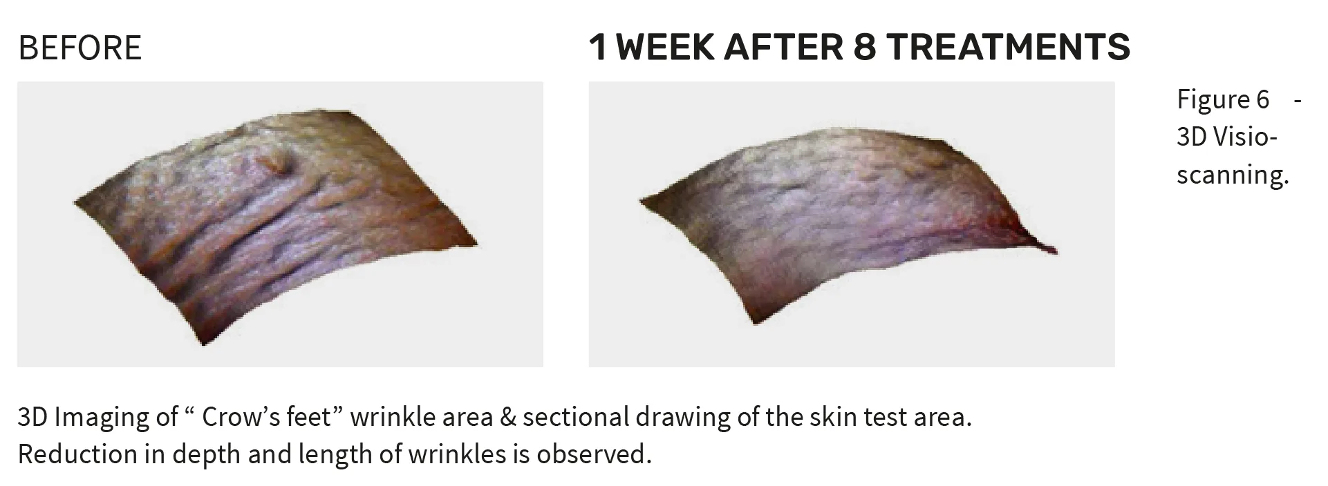 Potekaev et al. (2013) evaluated the safety and efficacy of the Tripollar RF & DMA technologies in 20 women aged 35-65 (average age 43) who received 8 weekly treatments for facial wrinkles. Results of the quantitative measures used in this study demonstrate the safety and clinical benefit of Tripollar RF & DMA technologies due to their combined effects for skin rejuvenation and the treatment of facial wrinkles (5). Efficacy: Tripollar RF & DMA technologies demonstrated significant improvement for all measured skin characteristics after 8 treatments with additional improvement at one-month follow-up. At the follow-up visit, measures demonstrated reduction in skin scaliness and roughness of over 40% and 83% increase in skin smoothness. Significant improvements were observed in skin tonus, lifting effect, reduction of sharpness of mimic and static wrinkles, and the improvement of facial skin color homogeneity. These findings were measured by non-invasive quantitative methods including 3D Visio-scanning (figure 6), micro-topography by ultrasonic derma scanning and micro-circulation of the facial skin by Laser Doppler Flowmetry (LDF). Safety: No adverse events were detected. No negative sensations or signs of irritation were experienced during the treatment. Downtime: Immediately after treatment, some patients reported transient erythema and slight edema that lasted several hours. Conclusions: Tripollar RF & DMA technologies are non-invasive, effective, safe, and virtually painless treatment for reduction of wrinkles and facial skin rejuvenation.