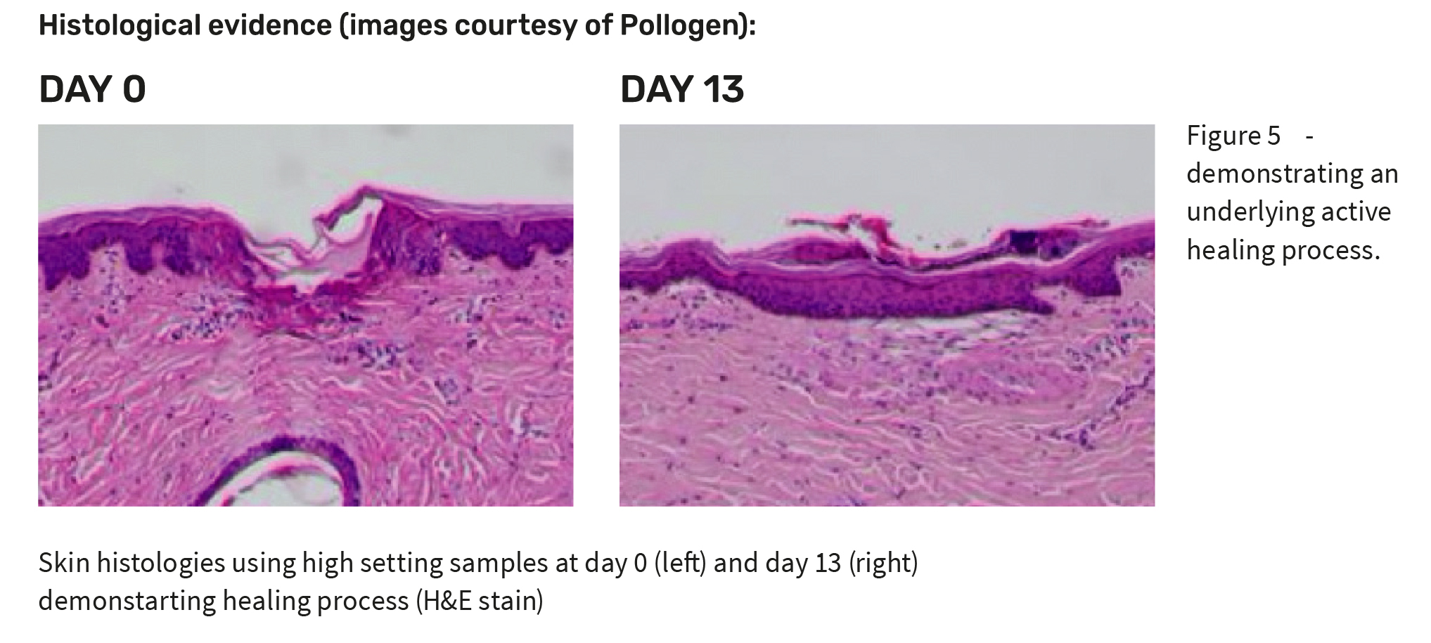 In-Vivo histology analysis results showed distinct epidermal ablation and dermal coagulation. Difference between high and low energy settings was observed in terms of the extent and rate of the healing process, with deeper dermal changes at higher energy levels, during the days post procedure. As can be seen in the Day 0 image there is a significant Epidermal removal allowing for optimal Epidermal fractional renewal while providing subtle upper dermal coagulative effect leading to dermal renewal. Complete regeneration of the epidermis and dermis with sub-epidermal healing observed after 13 days when using low energy, and demonstrating an underlying active healing process when using high energy (figure 5). Histological evidence (images courtesy of Pollogen):