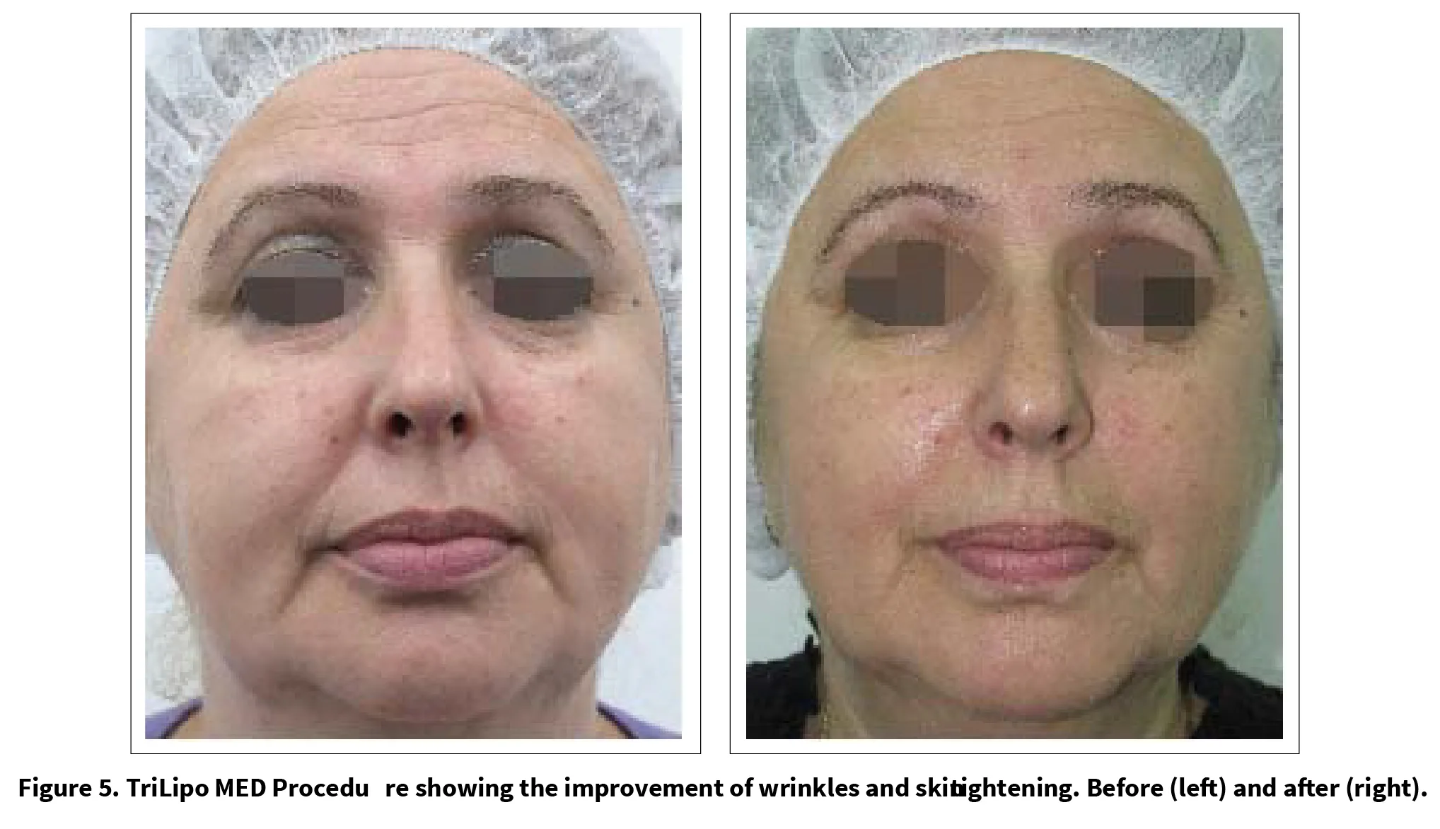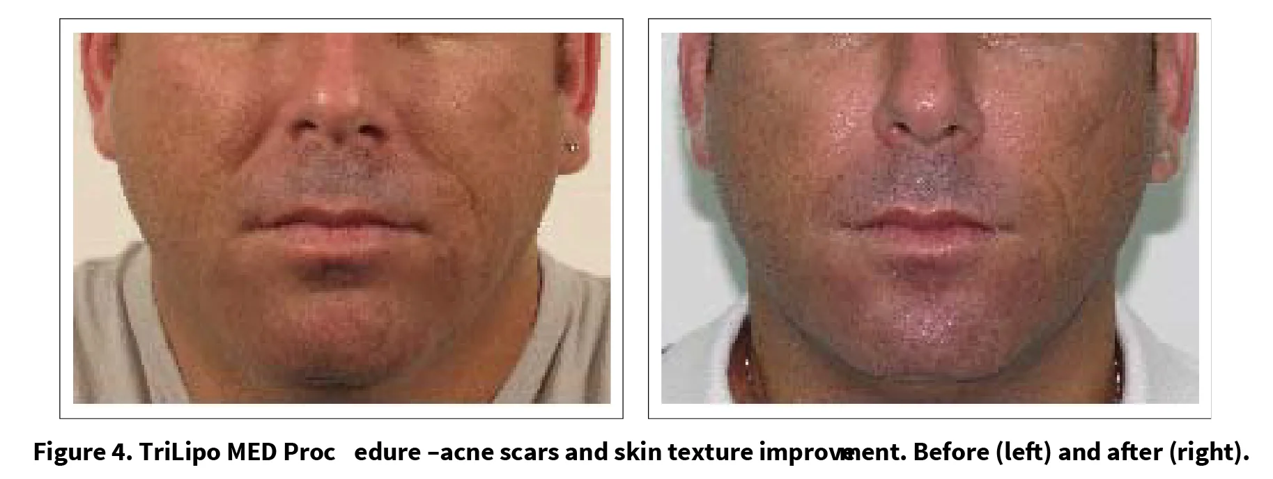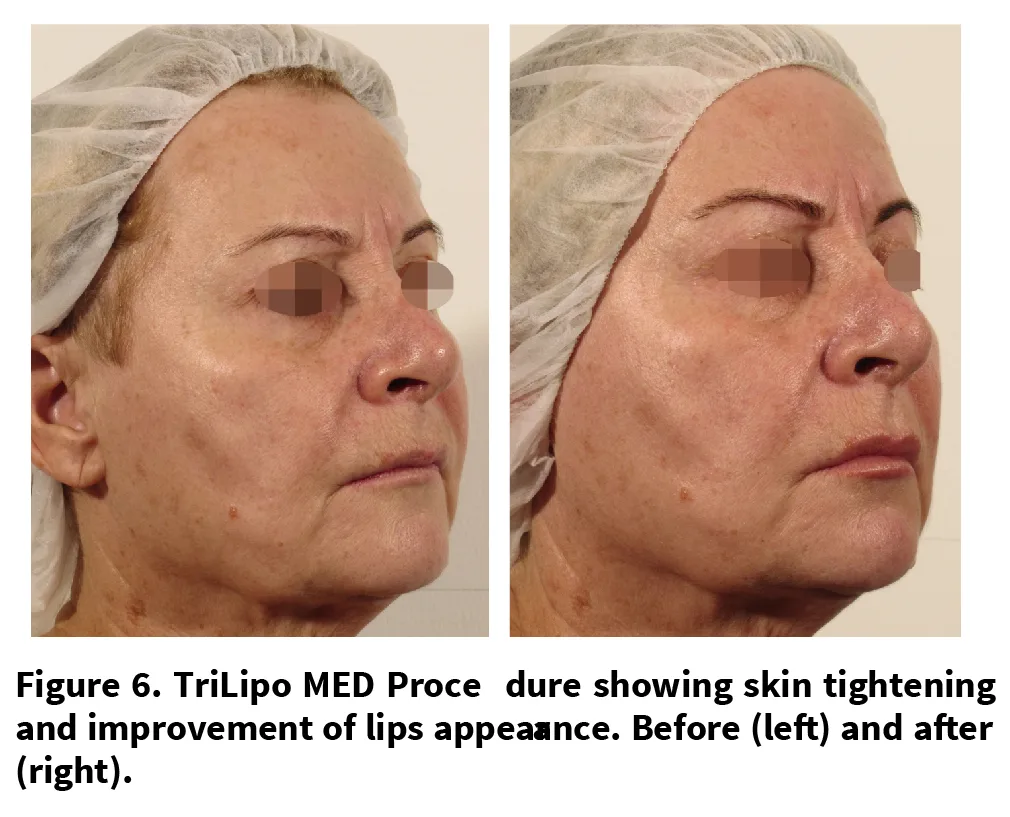 The results of the TriFractional treatments included reduction of fine wrinkles, improved appearance of acne scars, a general improvement of skin texture and scar tissue, skin brightening, skin tightening, improvement of skin irregularities and reduction in pore size. The subjects treated with the TriLipo Med procedure displayed an additional facial contouring effect especially visible on the jaw-line area.