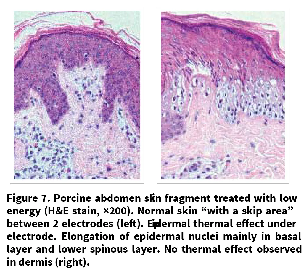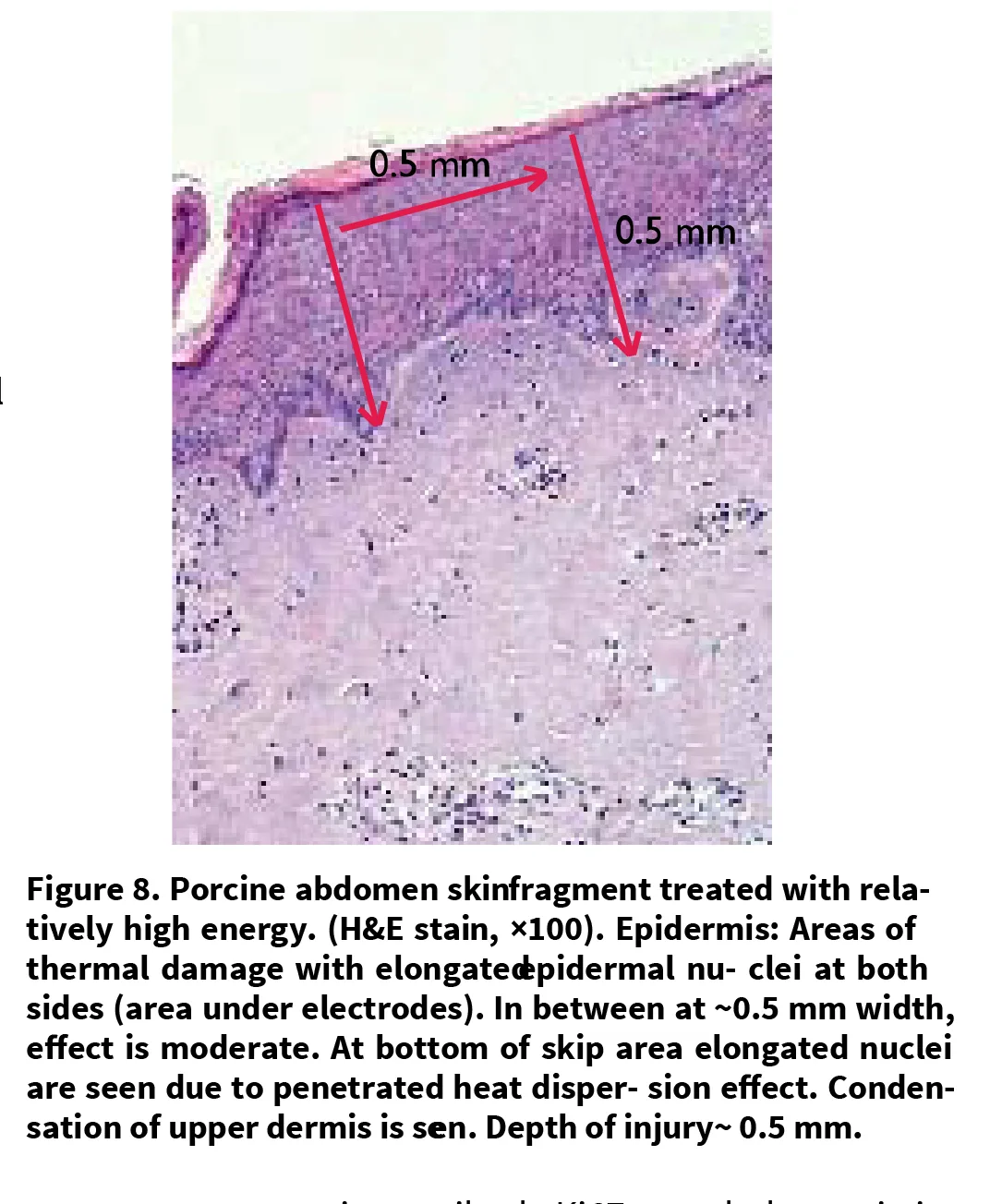 Depth of injury is in direct correlation to the energy level used. In samples from abdomen skin treated with low power, epidermal injury was the least prominent and only the basal lower spinous epidermis layer was involved and the dermis was spared. The epidermal changes in this series were focal with skip area of normal epidermis in between the involved foci. All the other series showed both epidermal and dermal injury correlated with the level of energy in terms of depth and width.