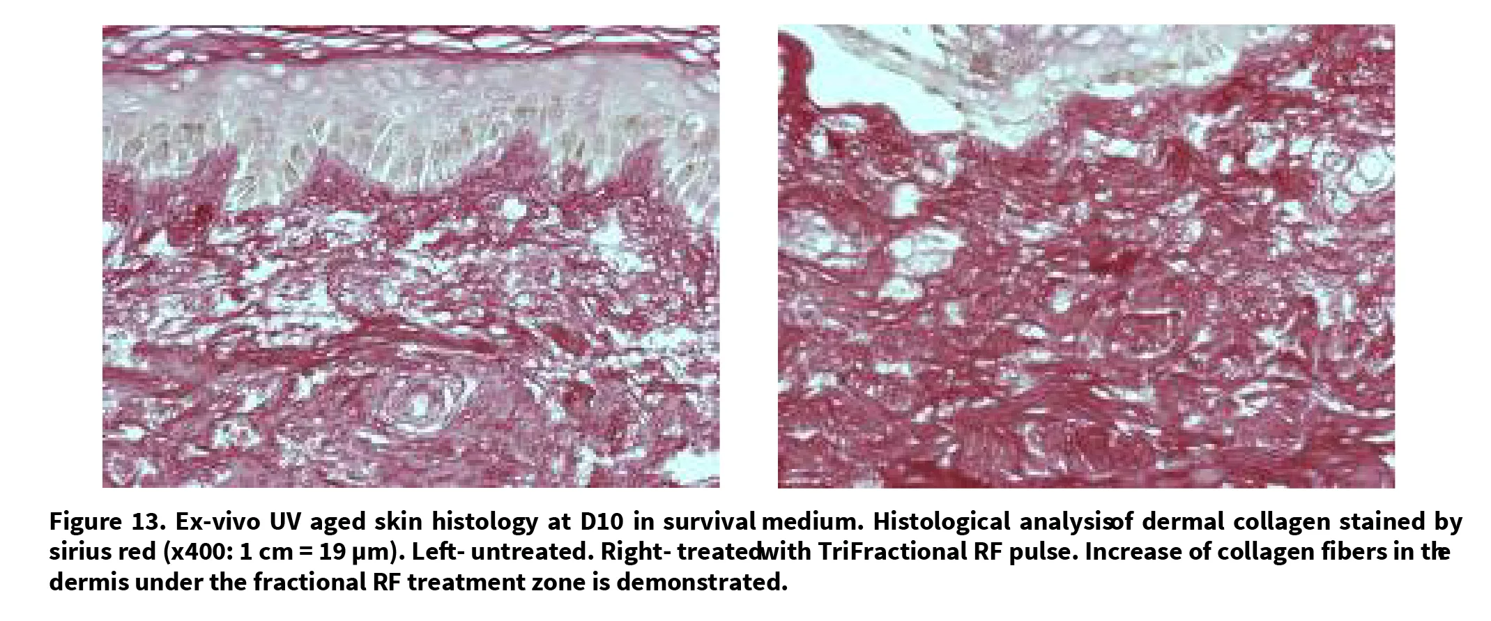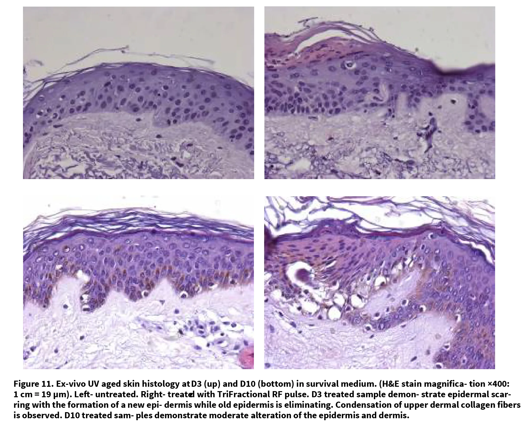 To demonstrate the TriFractional effect on epidermal and dermal skin layers, preliminary tests were performed on porcine skin followed by comprehensive in-vivo and ex-vivo histological examinations.