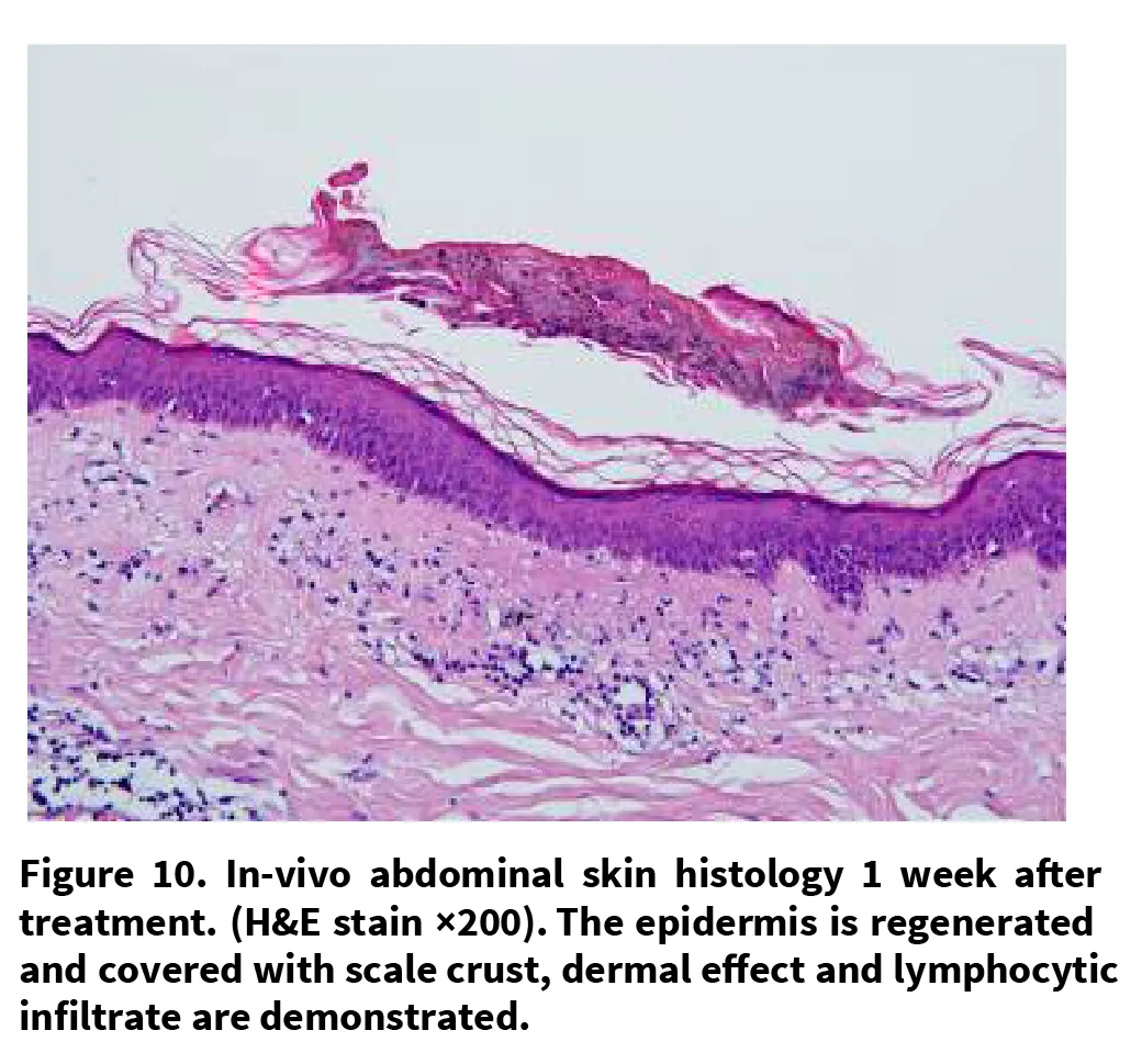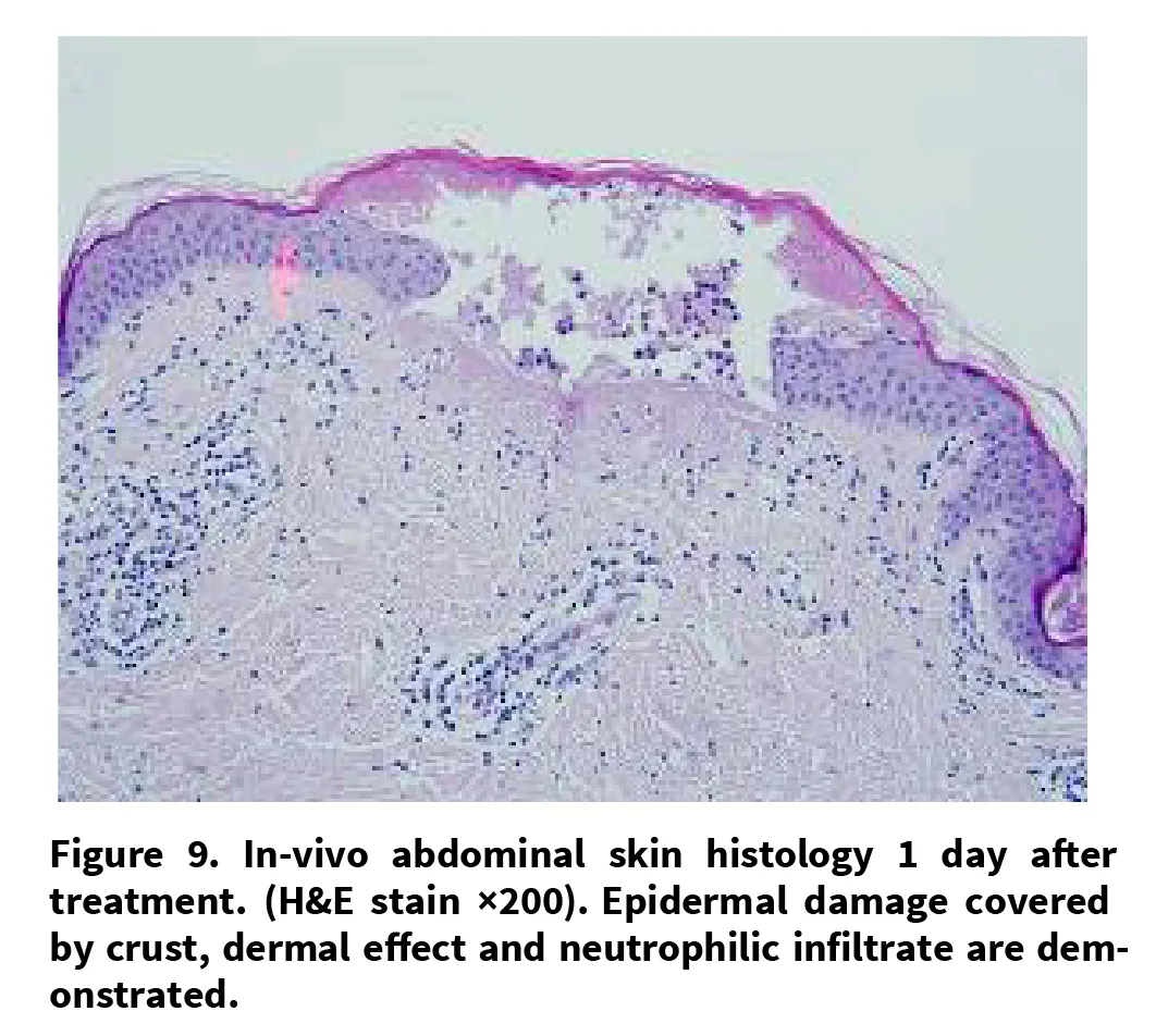 Samples taken one day after treatment showed epidermal necrosis in the involved area and an effect on the papillary as well as upper reticular dermal collagen areas. Skip areas are visible between affected areas. Neutrophilic infiltrate was present (Figure 9).