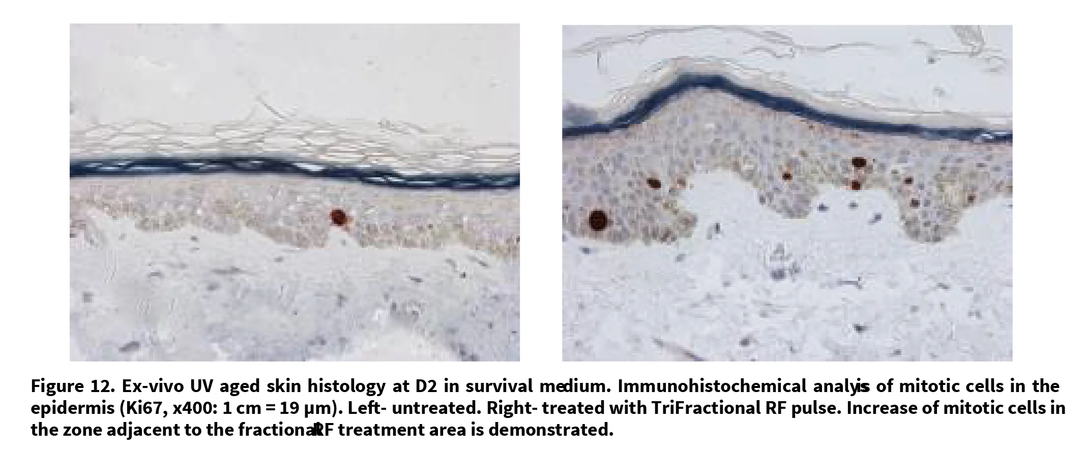 treatment zones using antibody Ki67 revealed a statistic- cally significant augmentation of positive epithelial cells (Figure 12). The percent of these mitotic cells rose from an average of 3.07 ± 1.57% in experimentally aged skin to 8.9 ± 3.03% in the skin treated by TriFractional RF (p = 0.0017). This represents an increase of nearly 3 times the amount of positive epithelial cells between experi- mentally aged skin and experimentally aged skin treated by fractional RF.