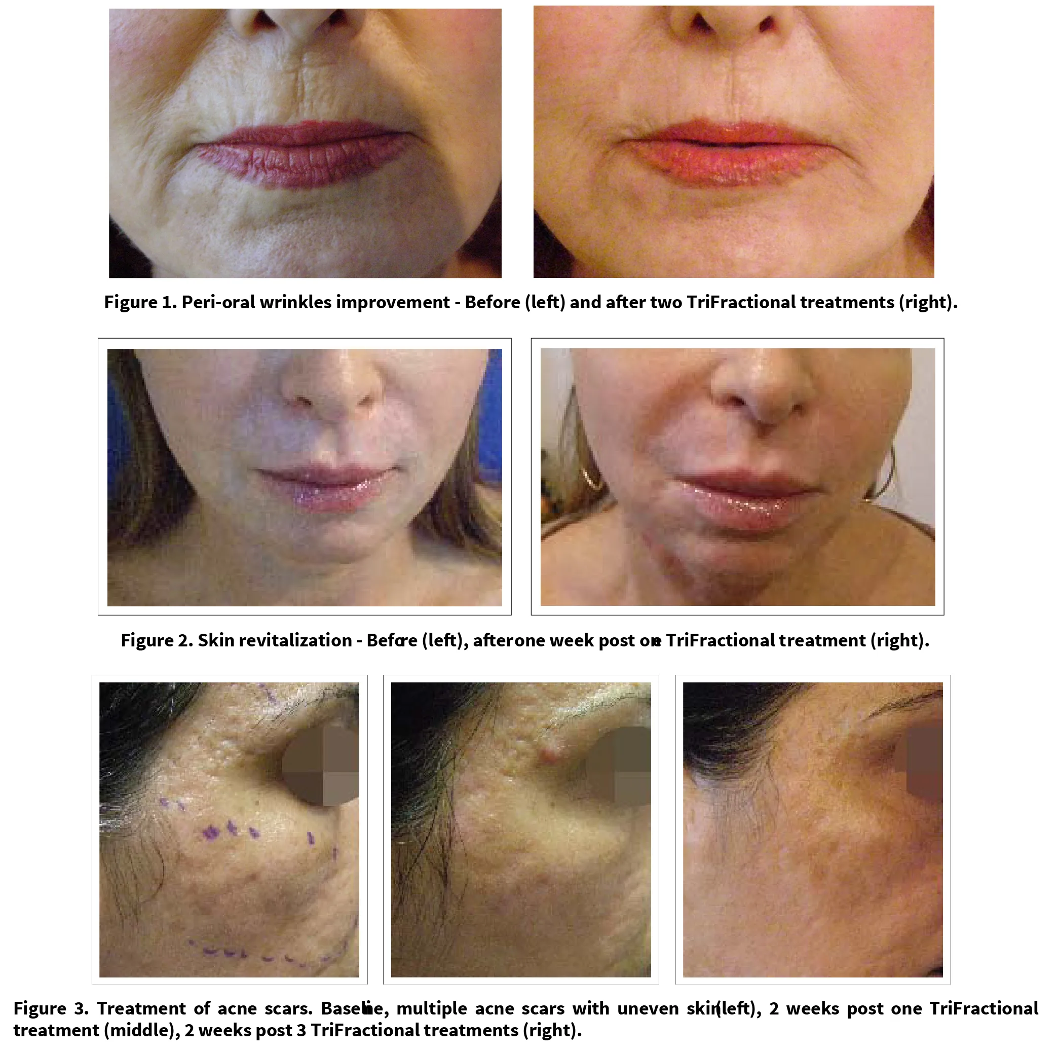 No significant undesired effects were experienced by the subjects and they reported a tolerable pain level. All subjects expressed satisfaction with the clinical results. Figures 1 – 3 demonstrate results of TriFractional treatments. Figure 1 shows impressive peri-oral wrinkles improvement after two TriFractional treatments.