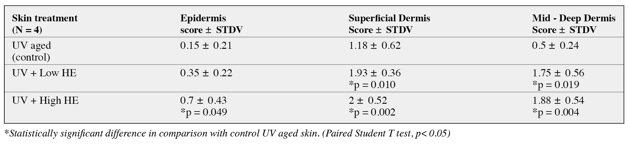 *Statistically significant difference in comparison with control UV aged skin. (Paired Student T test, p<0.05)