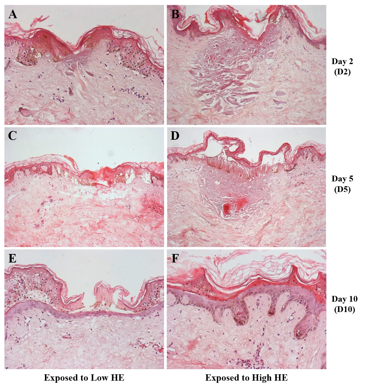 Figure 2 demonstrates the evolvement of epidermal and dermal modifications following exposure to low and high HE parameters.