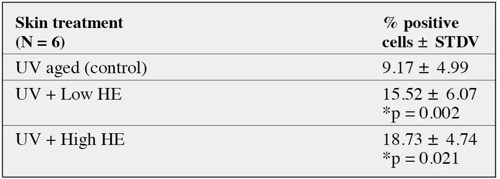 The immuno-detection observed just adjacent to the HE treatment zones on the whole slice (and not in the impact zone itself), revealed a very statistically significant augmen-tation of positive epithelial cells at D2. The percentage of mitotic cells rose from an average of 9.17% in experimen-tally aged skin to 15.52% in the skin exposed to low levels of radiofrequency (p = 0.002) and to 18.73% in the skin treated by HE high levels (p = 0.021).