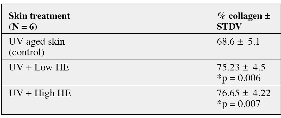 mentation translates to a 10-11% increase for fragments exposed to Low and High HE levels respectively. It should be noted that calculations are conducted on the whole slices and not on confined treatment impact zones. The results for the histological quantification of dermal collagen are expressed in table 2 and in figure 4.