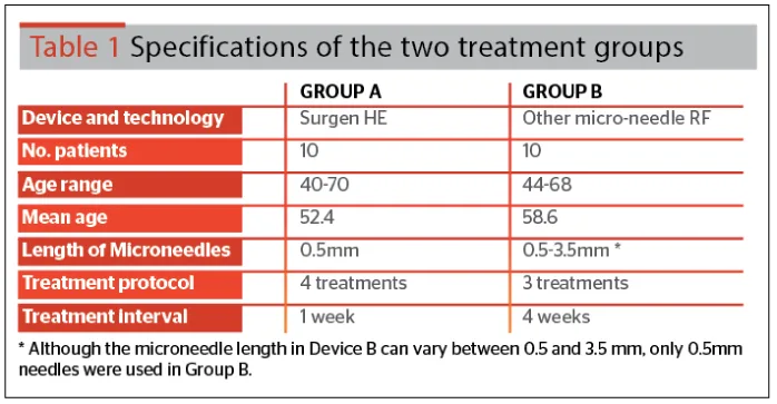 The current study demonstrated that treatment with both RF microneedle devices resulted in improvement of skin laxity and general neck appearance. Group A, treated with the HE technology, a combination of RF and an additional electrical energy intended to enhance clinical effect, did not require a local anesthesia. Therefore, the general visit time was shorter. The subjects of group B (treated with other microneedle RF), required application of a topical anesthesia, extending visit duration, however, pain rating was still higher than group A.