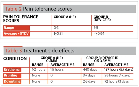The microneedles of the HE technology device (0.5 mm long and 150μm thick) enter the skin via a smart RF assisted penetration, enabling a bloodless, painless penetration. The microneedles of Device B, penetrated the skin using mechanical pressure and penetration is accompanied by bleeding and pain. In addition, needle thickness, which is much thicker for device B (200μm in Device B, as compared to 150μm in Device A), might also add to the downtime and pain associated with the Device A modality.