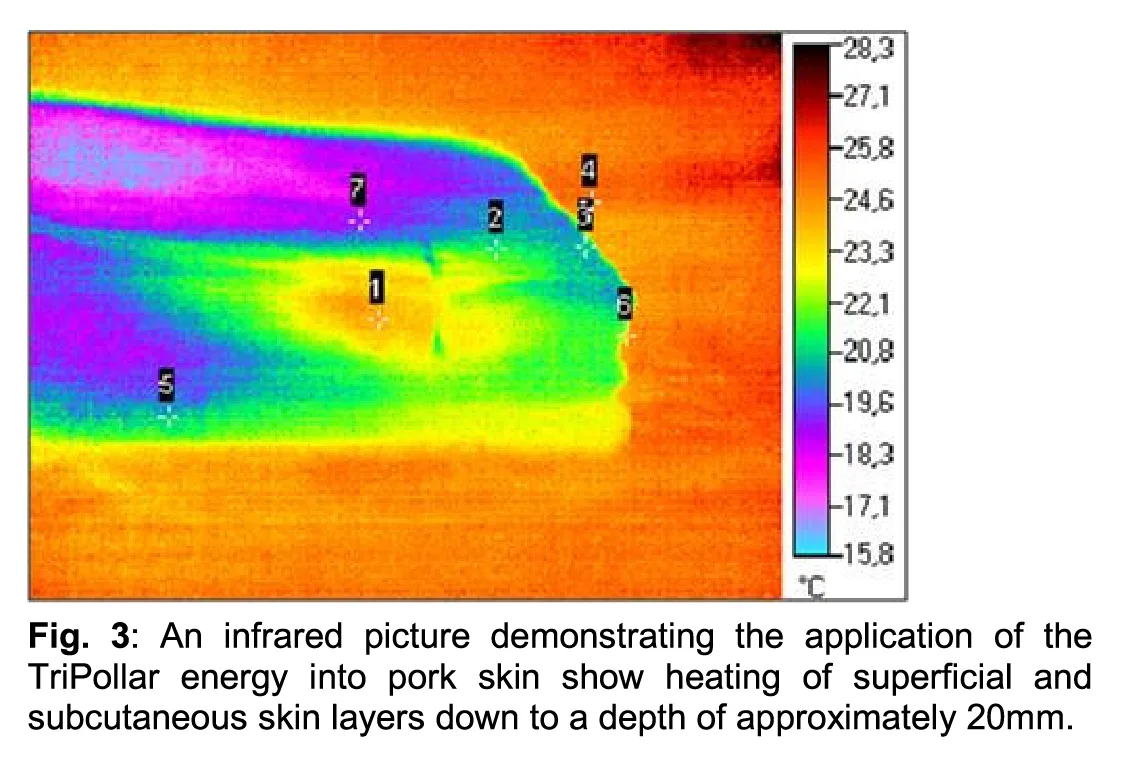 average distance between the 3 electrodes and simultaneously heats the dermal and subcutaneous